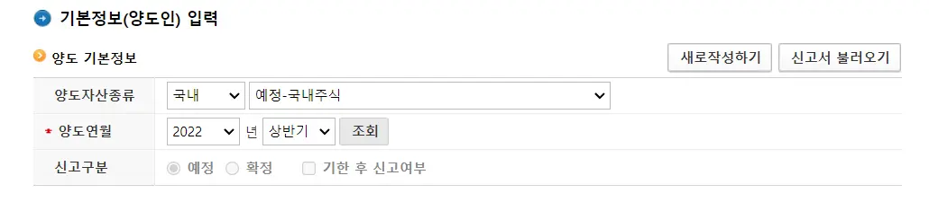 아래 이미지를 참고하여 양도 기본정보를 입력 후 조회 버튼 클릭합니다.