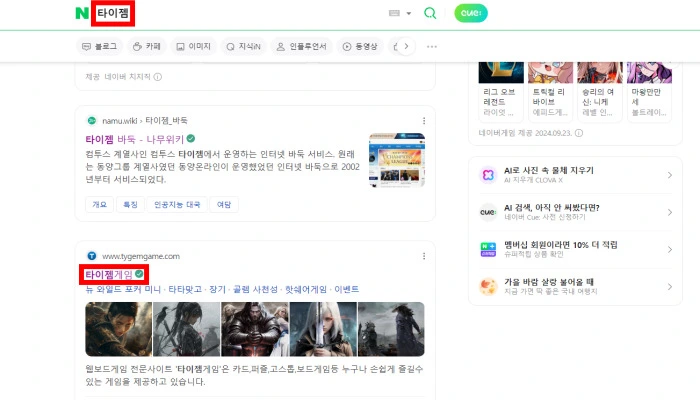 ①. 타이젬 홈페이지 접속: 먼저, 네이버 검색창에 "타이젬"을 입력합니다. 검색 결과에서 타이젬게임이라는 링크를 클릭하여 타이젬 공식 홈페이지로 이동합니다.