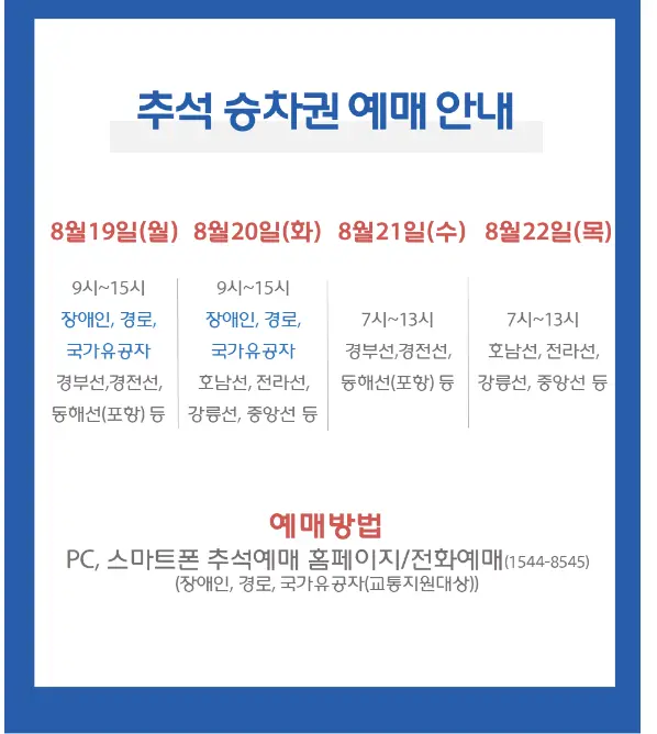 - 8월 21일(수): 경부선, 경전선, 동해선(포항) 예매 가능 (시간: 07:00 ~ 13:00)