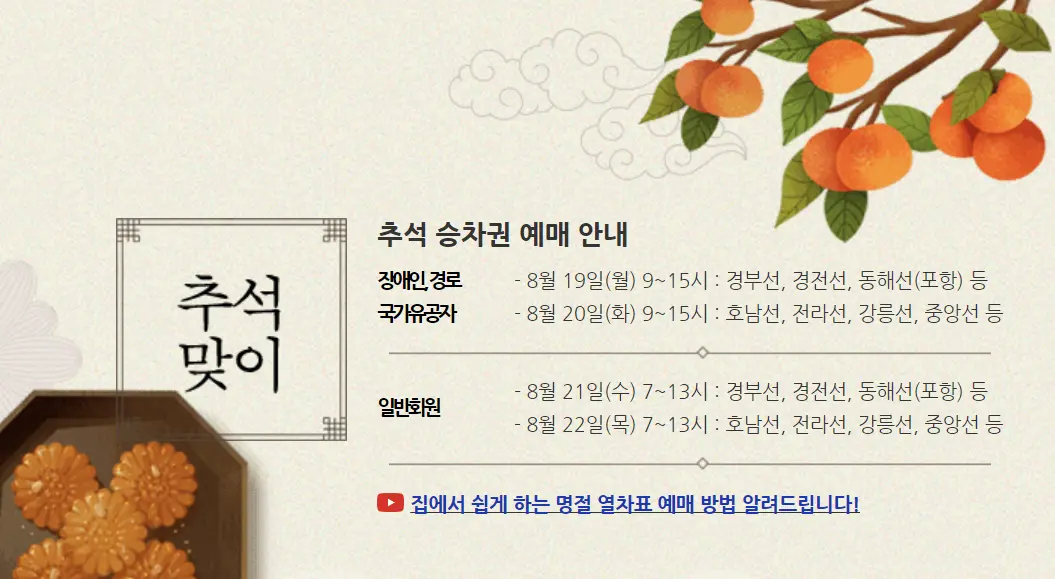 추석이 다가오면 많은 분들이 여유롭게 생각하다가 예매 기간이 가까워져 놀라곤 합니다. 지방으로 내려가실 분들은 반드시 예매 일자와 시간을 확인하시어 미리 준비하시기 바랍니다.